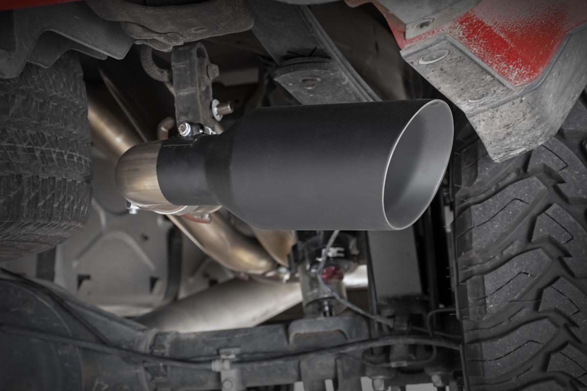 Rough Country Dual Cat-Back Exhaust Systems feature a set of high-temp resistant, dual-wall 304 black stainless tips with RC logo for an improved, aggressive look. Upgrading your exhaust note has never been easier! Each kit conveniently installs onto the factory hangers and features stainless clamps for easy assembly with no welding required! \