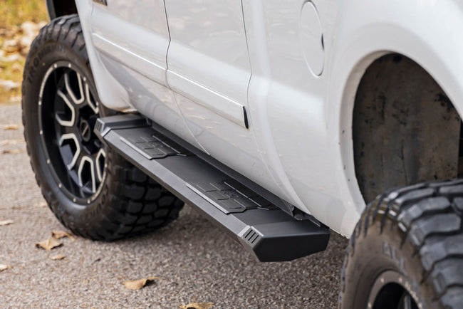 Level up your truck's functionality and style with the Rough Country HD2 Running Boards. Crafted with precision and designed for those who demand the best, our HD2 running board is engineered to be your step for a lifetime of adventures.Corrosion-Resistant Aluminum: Imagine stepping into your truck on a platform built for battle. That's the HD2 experience. The HD2 combines the strength of 100% aluminum with a black powder coat finish, ensuring it's lightweight, corrosion-resistant, and rust-free.Rock-Solid Protection: We know the road can be tough! That's why our HD2 running board has durable composite endcaps. No more worrying about flying rocks and debris, these endcaps are made to handle the rough stuff and still look good.Spacious Stepping: Got big boots? No sweat! The HD2 boasts a generous 5" wide footing area. Now you can get in and out with ease, no matter how muddy or dusty your adventures get. And with a non-slip surface, you'll stay steady on your feet, rain or shine.Style Meets Function: We know looks matter. That's why our running board isn't just durable - it's made with a sleek, stylish design that blends flawlessly with your truck, providing a smooth cover for any exposed frame.Easy Installation: No need to spend hours in the garage. Our running board is designed for easy, drill-free installation so that you can hit the road in no time. Plus, it's compatible with most truck models, making it a hassle-free upgrade.With hassle-free installation and design that's as rugged as it is stylish, your truck will turn heads and tackle trails like never before.