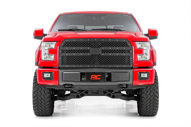Give the front-end of your Ford F-150 a unique look with Rough CountryΓÇÖs Mesh Grille kit! This easy to install grille replacement kit swaps out your stock grille with the eye-catching, head-turning good looks of this aftermarket upgrade. With a unique, laser-cut mesh pattern surrounded by stylish, stainless steel rivets, this grill gives your truck a more menacing look thatΓÇÖs sure to draw attention.This easy-to-install grille requires no cutting or drilling and can be returned to stock at any time. Each kit is powdercoated black to resist corrosion and give a long lifespan of good looks. This kit also allows you to retain your active grille shutter system and front camera and features Rough CountryΓÇÖs Lifetime Replacement Warranty!\
