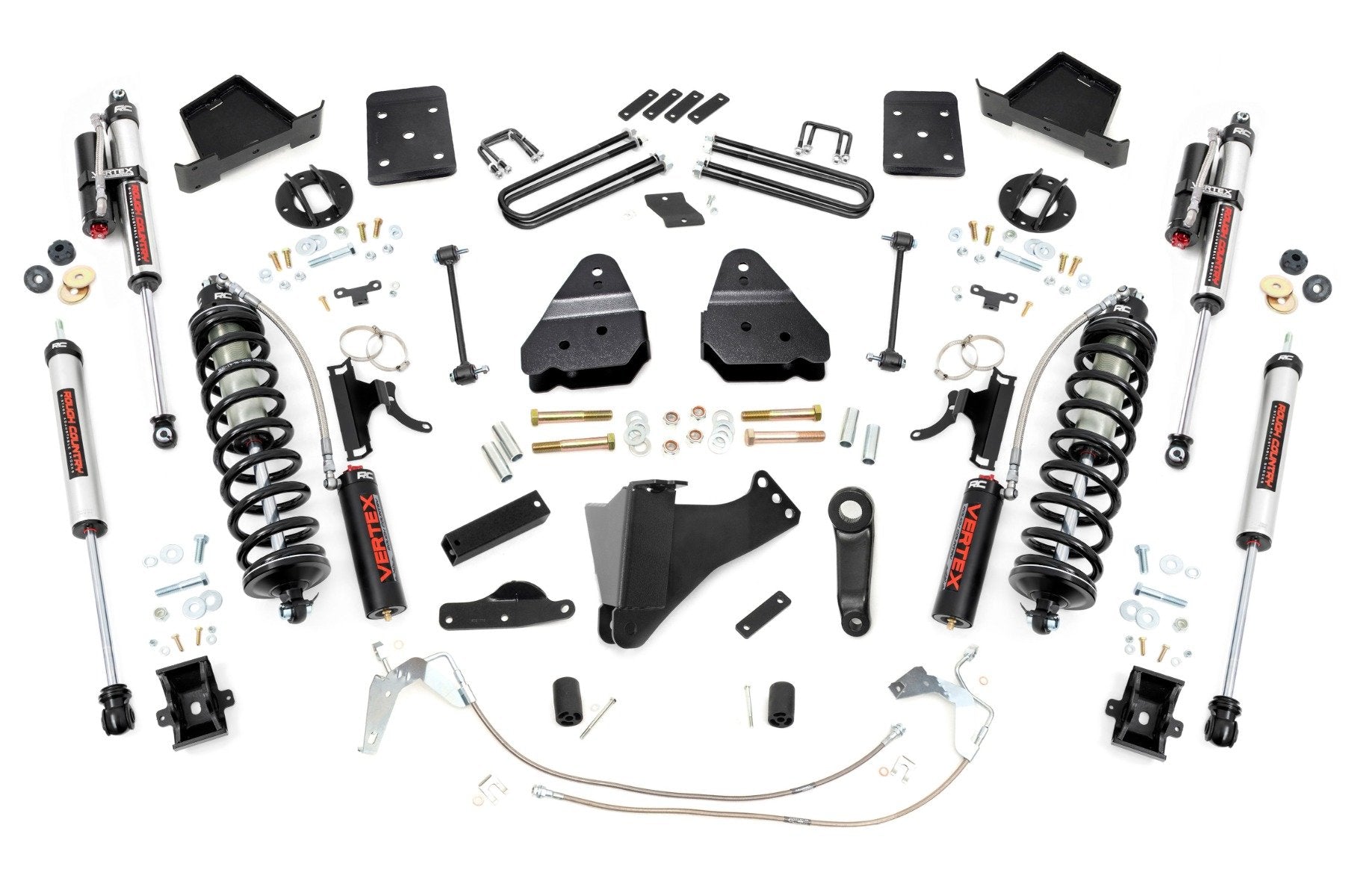 Durable Components. When changing a vehicle's suspension, the key to preserving ride quality is keeping the geometry of all suspension components as close to their factory angles as possible. Rough Country's new 4.5-inch Suspension Lift features a set of ultra-durable radius arm drop brackets, precision fit to bolt right into the factory mounts for an easier install and a more factory-like angle. Utilizing this conversion kit you're removing the factory independent coil shock and coil set-up and replacing it with a massive 2.5in piston, nitrogen-charged, 8-stage adjustable Vertex Coilover. Rough CountryΓÇÖs Vertex Coilovers feature a monotube design with an external reservoir for increased oil capacity and damping sensitivity. When it comes to investing in a high-end kit, youΓÇÖll be pleased to find that Rough CountryΓÇÖs 2.5in piston design is beefier and offers an impressive 56% greater fluid capacity than the average reservoir shock. Each kit is paired with a monotube shock that provides optimal damping control.\