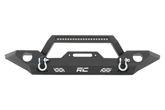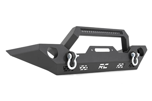 Upgrade Your Jeep's Front End: Give your Jeep aggressive styling and unmatched protection with Rough Country's Full Width LED Winch Bumper. Engineered from heavy-duty 5/32-inch steel and reinforced with 2x.120-inch tubing, this bumper is built to handle the toughest trails while enhancing your rig's rugged appearance.Full-Width Strength with Trail-Ready Clearance: Designed to complement factory flares or aftermarket modifications, this bumper features tapered ends and a high-clearance profile for improved approach angles and articulation when tackling obstacles head-on.Light the Way Forward: An integrated 20-inch Single-Row Rough Country LED Light Bar delivers 7,200 lumens and 100 watts of powerful forward-facing illumination, ensuring you're ready for night rides and low-visibility conditions. Built-in fog light ports retain your factory lights, complete with a unique "angry eyes" look that adds extra attitude.Ready for Recovery: Whether you're hitting deep mud or rocky terrain, this bumper has you covered with a built-in winch plate that accommodates any standard-size winch. A set of included 4.75-ton capacity D-rings and reinforced D-ring mounts, welded inside and out, provide dependable recovery points you can trust when the trail gets rough.Built to Last: Finished in a sleek satin black powder coat, this bumper not only looks sharp but also provides superior corrosion resistance against the elements.