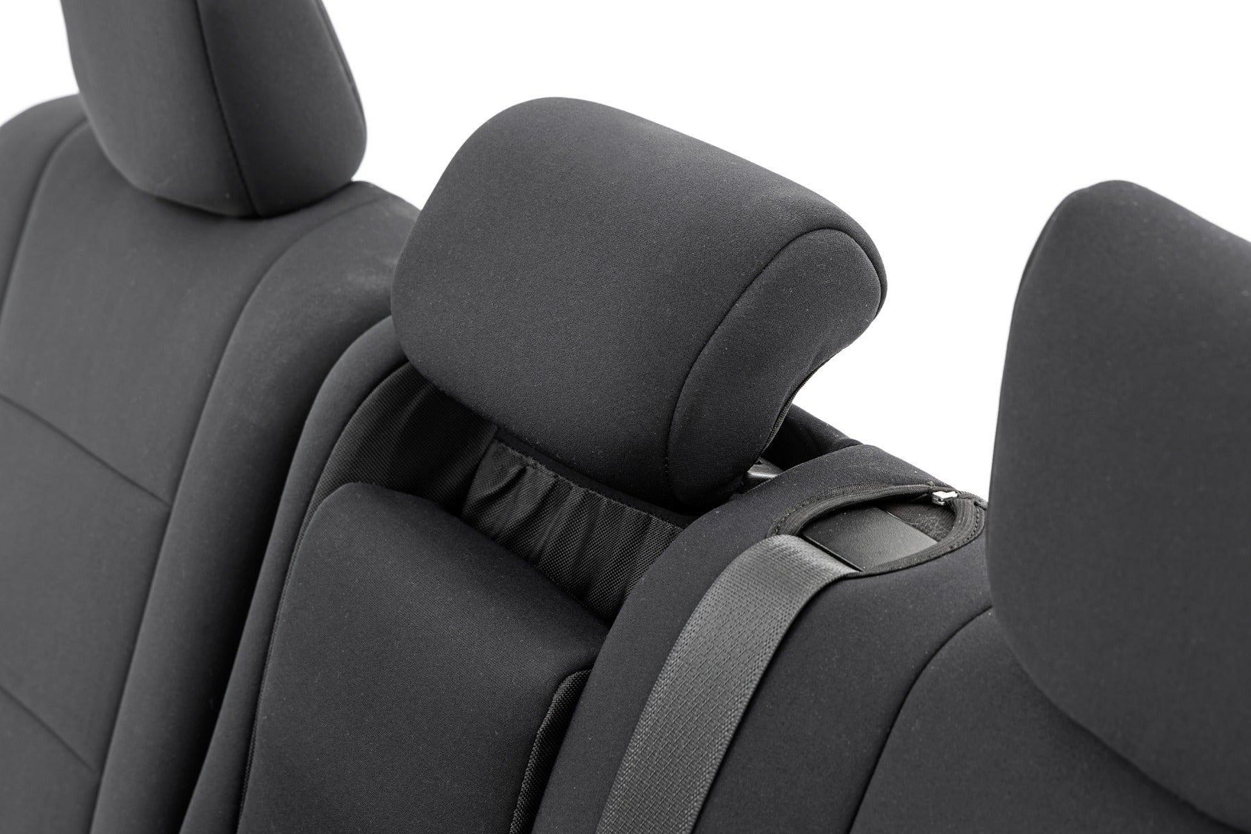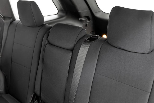 Want to protect your seats or are your seats showing signs of wear and tear from daily use? Say goodbye to unsightly stains and deterioration with Rough Country's Neoprene Seat Covers - the ultimate solution for preserving your vehicle's interior.Snug Fit for Optimal Protection: Our seat covers are tailored to fit your seats perfectly, providing a protective barrier against spills, scratches, and everyday wear and tear.Factory-Spec Construction: Engineered to meet factory specifications, our covers blend seamlessly with your vehicle's interior, giving it a fresh, new look without compromising on quality or style.Four-Layer Defense: With a four-layer construction featuring foam padding and a durable polyester shell, our seat covers offer unmatched protection and longevity, ensuring your seats stay looking new for years to come.Breathable and Water-Resistant: The neoprene layer not only provides breathability for added comfort but also boasts water-resistant properties, safeguarding your seats from spills and stains.Complete Coverage: Our covers come with full protection for your front seats, including headrest covers where applicable, as well as rear covers to shield your back seats from children and pet-related mishaps.Peace of Mind Warranty: Rest easy knowing your purchase is backed by our two-year warranty, giving you confidence in the durability and reliability of our product.Don't let worn-out seats diminish your driving experience. Upgrade to Neoprene Seat Covers today and enjoy a fresh, stylish interior that's protected against the rigors of daily life on the road.