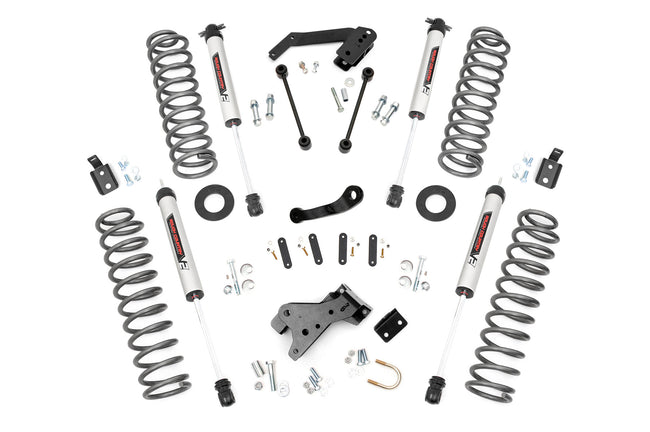 Total transformation for your Jeep starts with Rough Country's 4-Inch Suspension Lift Kit. This all-inclusive upgrade delivers aggressive styling, enhanced ground clearance, and the rugged performance you need to conquer any trail with confidence.Engineered for Superior Suspension Geometry: Lifted coil springs pair with coil correction plates that adjust the rear coil spring angle by 10 degrees. This design improves suspension efficiency, reduces component wear, and optimizes vibration dampening across rough terrain.Custom Shock Options: Tailor your ride with nitrogen-charged N3 shocks, V2, M1 Monotube, or premium M1R shocks. Whether you want balanced on-road comfort or elite off-road control, this kit lets you fine-tune performance to your driving style.Clears Up to 35-Inch Tires: Gain the clearance to run up to 35-inch tires, giving your Jeep a commanding stance and greater off-road capability.Backed by Rough Country's Limited Lifetime Warranty: Drive with confidence knowing your investment is protected with Rough Country's limited lifetime replacement warranty.