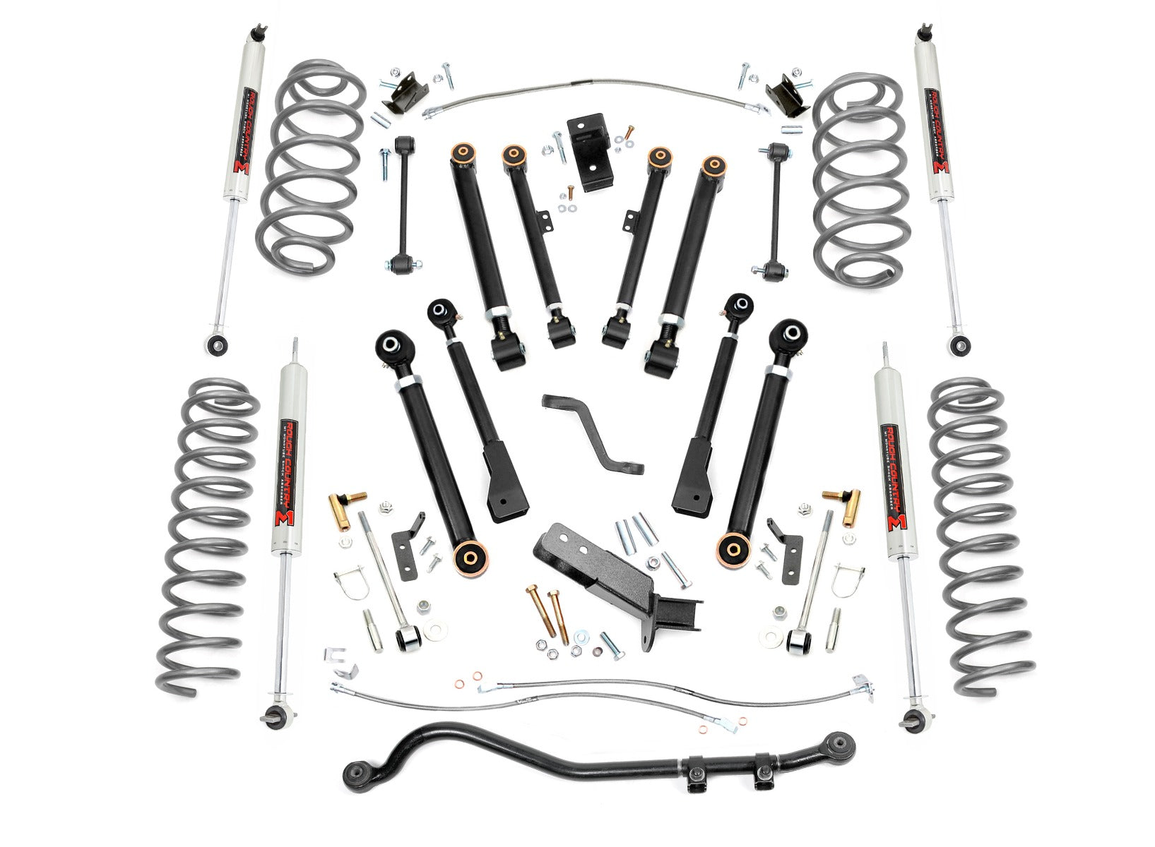 Total Transformation, On and Off the Trail: Give your Jeep TJ the ultimate upgrade with Rough Country's 4in X-Series Suspension Lift Kit. This all-inclusive package delivers everything you need for aggressive styling, increased ground clearance, and enhanced off-road capability.Precision Adjustable Control Arms: This kit includes front and rear upper and lower X-Flex Control Arms featuring a high-clearance design. Built with OEM-style rubber bushings, fully rebuildable flex joints, and massive 2.5" diameter bodies with 1.25" threads, these control arms are fully greasable for long-lasting durability and superior articulation. Fine-tune your ride height and suspension geometry with ease.Optimized Suspension Geometry: Lifted coil springs provide the perfect combination of ride height and vibration dampening, delivering optimal suspension performance across any terrain. This kit also includes durable stainless steel brake lines for improved reliability and safety.Heavy-Duty Forged Adjustable Track Bar: When it comes to strength and stability, the forged solid steel Adjustable Front Track Bar delivers. Weighing a robust 16 pounds, this track bar outmatches stock components, ensuring precise axle alignment and control even during extreme off-road flexing. It's fully adjustable on the vehicle and easy to install.Custom Shock Options for Any Terrain: Choose your ideal ride with Rough Country's premium shock upgrades. The included nitrogen-charged N3 shocks offer 10-stage variable valving and a 54mm shock body for faster cooling and up to 36kN tensile strength. For those craving next-level performance, optional V2 performance shocks or M1 monotube shocks are available to match your driving style.Confident, Balanced Stance: This lift kit levels the front of your Jeep with the rear, delivering a commanding, well-balanced look that performs as good as it looks.Peace of Mind Guaranteed: Backed by Rough Country's Limited Lifetime Replacement Warranty, you can hit the trails with confidence knowing your investment is protected.