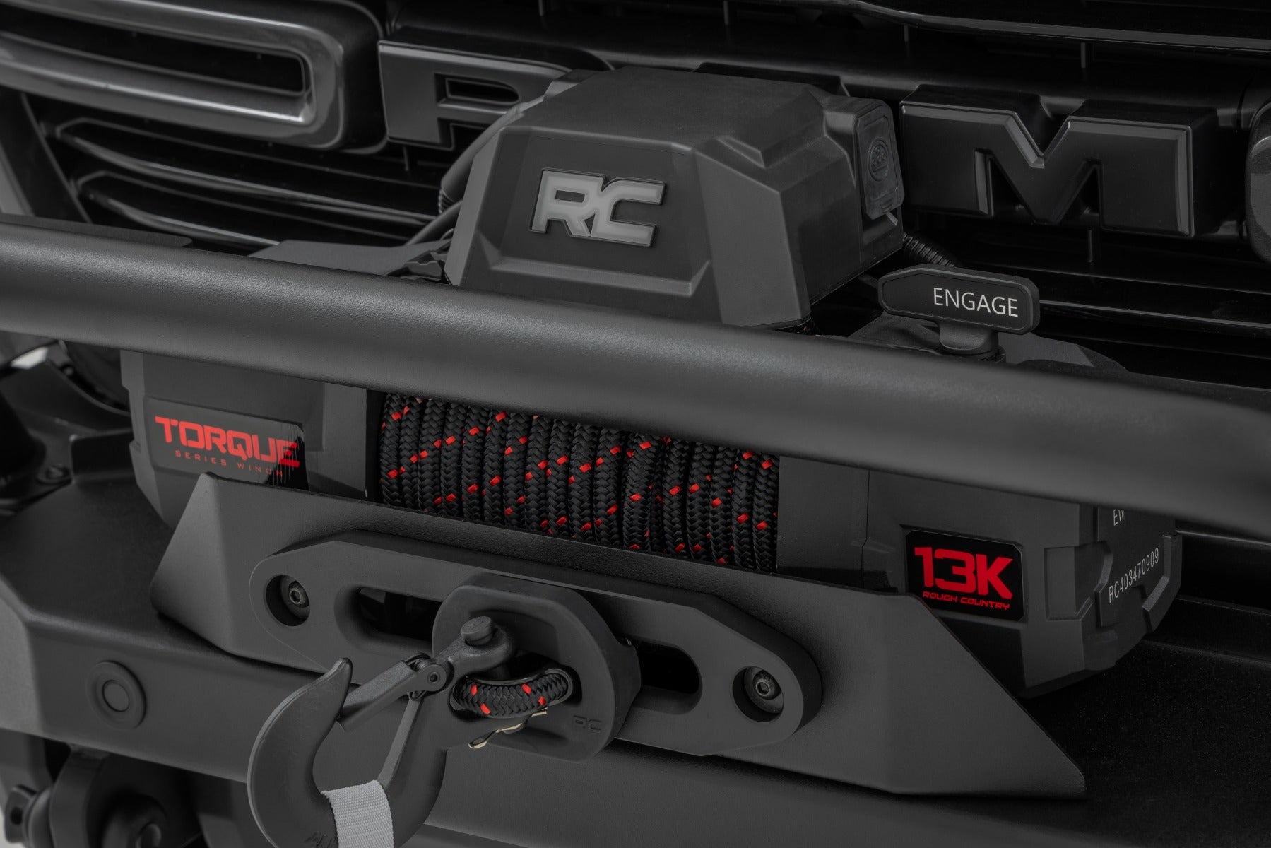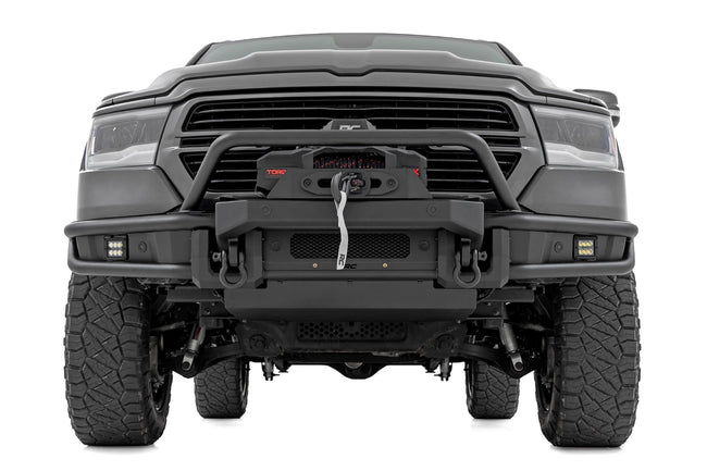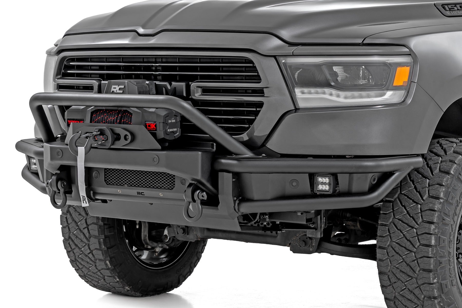 Take your truck's off-road capability and style to the next level with this rugged, trail-ready upgrade. Built for performance and designed to turn heads, this bumper is ready for any adventure.Sleek & Bold Design: Constructed with durable 2-inch diameter tubing and finished in a corrosion-resistant Satin Black coating, this bumper delivers a bold, aggressive look that complements your Ram 1500's rugged stance.Trail-Ready Strength: Equipped with a heavy-duty D-ring set boasting a massive 4.75-ton capacity, this bumper provides reliable recovery points for your toughest adventures.Ultimate Off-Road Protection: An integrated skid plate shields vital components from rocks, debris, and rough terrain, while the bolt-on stinger bar enhances front-end protection and style.Built-In Light Bar Mount: The stinger bar isn't just for protection - it also functions as a sturdy mount for an LED light bar, giving you the flexibility to enhance nighttime visibility on the trails.With bold styling, unbeatable strength, and essential off-road features, Rough Country's Front Tubular Bumper is the game-changing upgrade your Ram 1500 deserves. Ditch the stock look and conquer the trails with confidence!